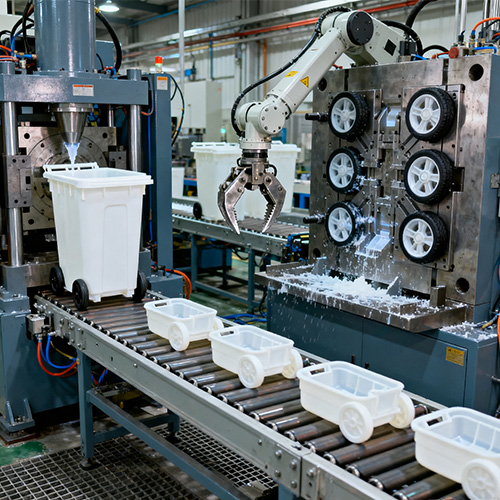 Suntikan wheelie bin suntikan merujuk kepada bekas penyimpanan sampah kapasiti yang dihasilkan oleh struktur teras pembuatan seperti badan bin dan penutup melalui proses pengacuan suntikan plastik berskala besar, kemudian memasangnya dengan aksesori seperti penggelek dan pemegang. Ciri terasnya menggunakan acuan suntikan satu keping untuk mencapai badan bin yang lancar (jumlah biasanya 120L-240L, beberapa tong industri sehingga 1000L). Berbanding dengan tong logam tradisional (mudah untuk karat) atau tong plastik secara manual (pengedap yang lemah), ia mempunyai kelebihan rintangan cuaca yang kuat, rintangan kesan, pencegahan kebocoran, dan pembersihan mudah. Ia digunakan secara meluas di jalan -jalan bandar, komuniti, sekolah, kilang dan senario lain, menyesuaikan diri dengan pengumpulan sampah dan pengangkutan yang mekanikal (boleh bekerjasama dengan trak mampatan sampah untuk pembuangan automatik).
