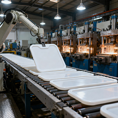 Bahan mentah adalah terutamanya HDPE, dan pengubahsuaian ditambah mengikut keperluan fungsional: agen anti-UV (0.5%-1%, meningkatkan rintangan cuaca), antioksidan (0.2%-0.5%, penangguhan penuaan), masterbatch warna (2%-3%, biasanya hijau, biru, kelabu, memenuhi piawaian sisa piawaian). Semasa penyediaan bahan mentah, zarah HDPE dicampur dengan bahan tambahan dan dimasukkan ke dalam pengering yang besar (kapasiti 1000-2000kg, suhu 80-100 ℃, masa 4-6 jam) untuk menghilangkan kelembapan sepenuhnya (mengelakkan gelembung dan penyusutan rongga selepas acuan suntikan). Pencetakan suntikan memerlukan mesin pengacuan suntikan mendatar yang besar (daya pengapit 1600-3000 tan, suntikan volum 5000-10000g), dan parameter proses ditetapkan: suhu barel 160-200 ℃ (bahagian depan 160-180 ℃, bahagian tengah 180-190, bahagian belakang 190-200 ℃) 20-30s, masa penyejukan 30-60s (diselaraskan mengikut ketebalan badan bin). Semasa suntikan, HDPE cair sama rata disuntik ke dalam rongga acuan melalui pelari panas. Selepas penyejukan dan penetapan, badan kosong kosong ditarik melalui mekanisme lonjakan yang besar (gabungan lengan pelindung + plat ejektor), dan sejumlah kecil sisa gerbang dikeluarkan secara manual selepas demolding (reka bentuk pelari panas dapat mengurangkan sisa).